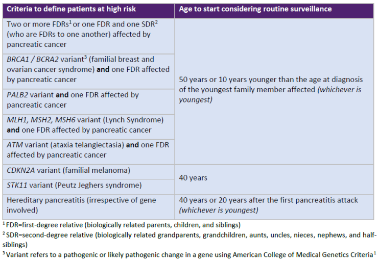 HRIs should be supported to make informed choices about surveillance, including understanding potential benefits and harms. Referral to a genetic counsellor or pancreatic specialist is recommended for detailed discussion. Click here for full information.