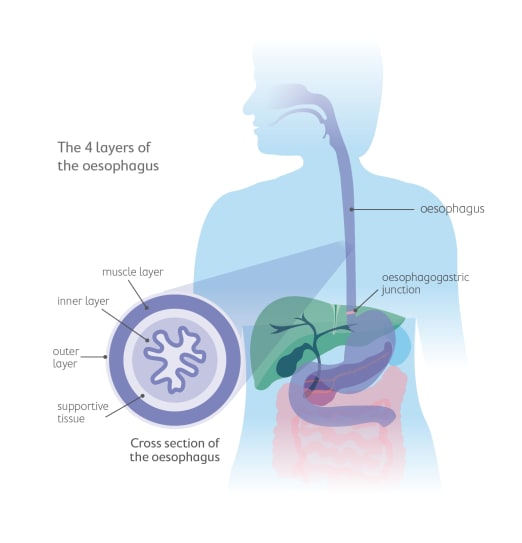 The oesophagus is a muscular tube that carries food and liquids from your throat to your stomach. Oesophageal cancer happens when abnormal cells in the oesophagus or oesophagogastric junction (where the oesophagus meets the stomach) grow out of control.