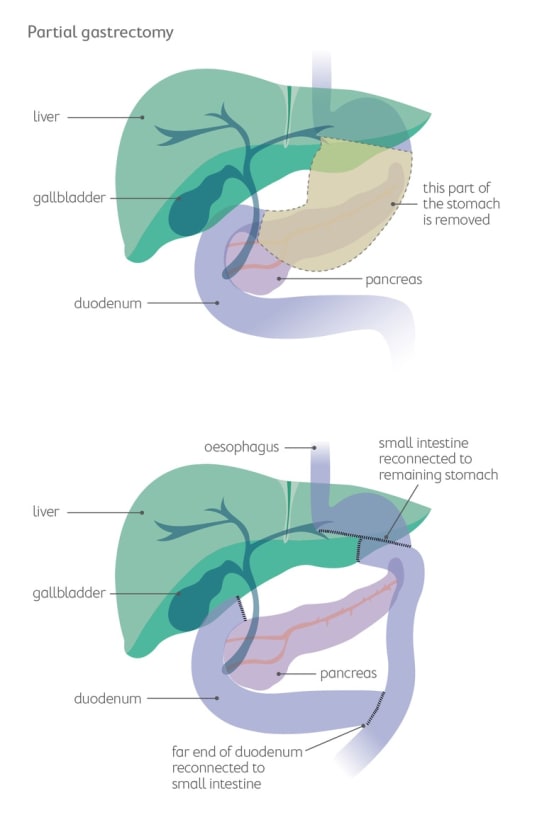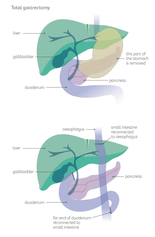 If the cancer is in the upper part of your stomach or has spread throughout it, the surgeon may need to remove the whole stomach. After this, your oesophagus (food pipe) is connected directly to your small intestine. A small pouch is made to help hold food.